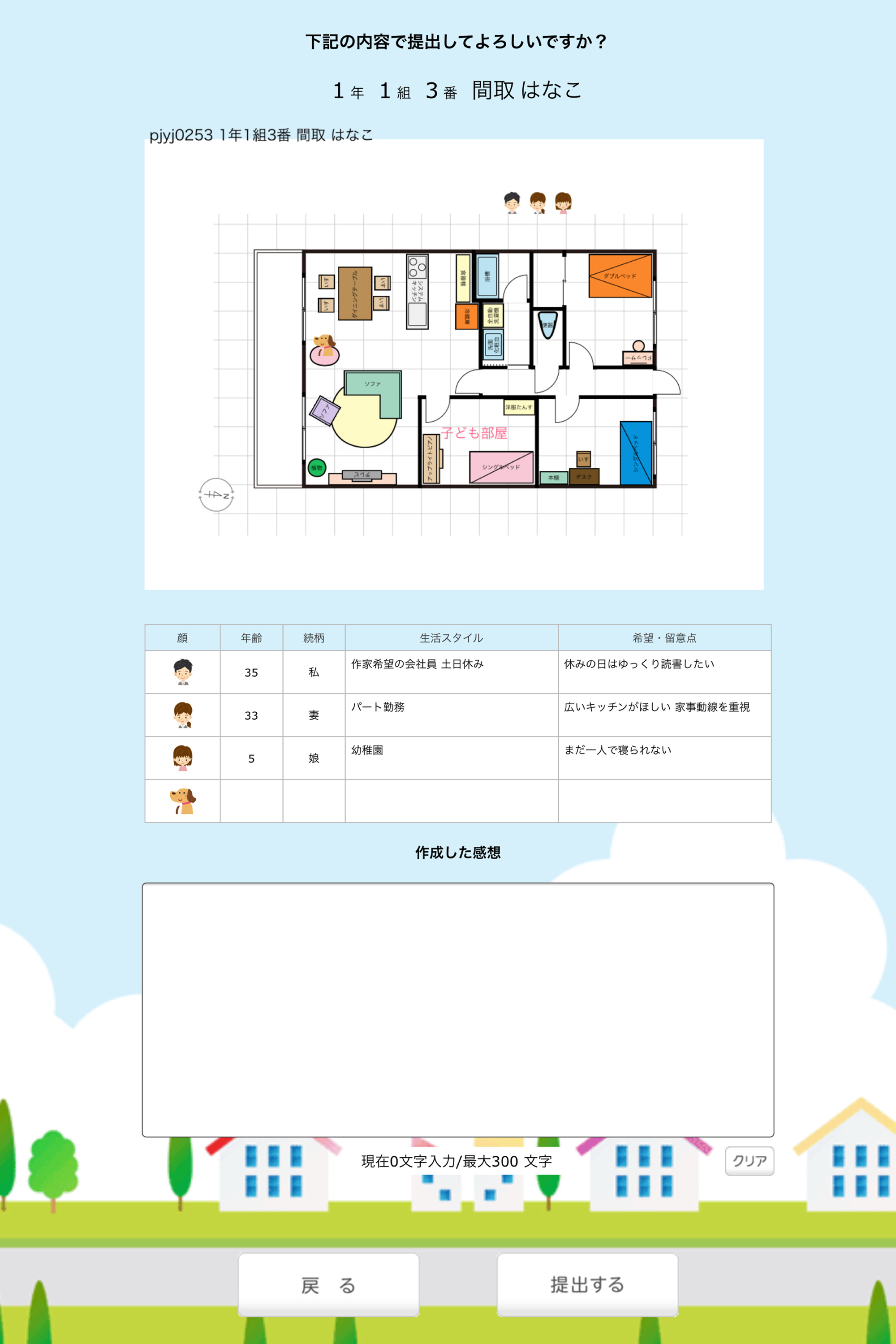 間取りが完成したら、感想を記入して先生へ提出します。